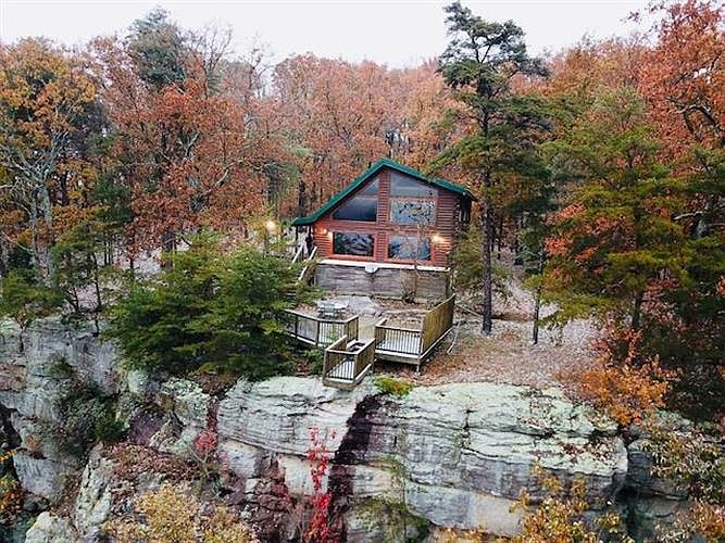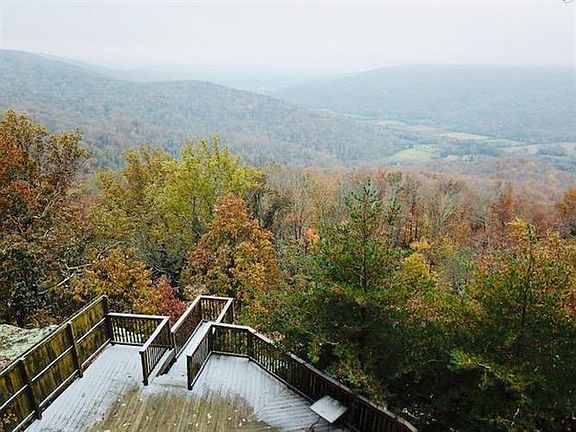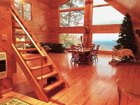 Log cabin with spectacular views located in a gated, HOA community. Private, wooded 2 acre lot overlooking a mountain bluff. Over 3000 square feet. Two story window view. First floor master suite, large tile shower three shower heads. Large loft big enough for more rooms. Outdoor hot tub, outdoor shower, indoor sauna. Appliances included. Buyer willing to sell furnished. Option to join Hardwood Forest Preserve and enjoy hunting, fishing, ATV's, archery range, hiking trails, and waterfalls!