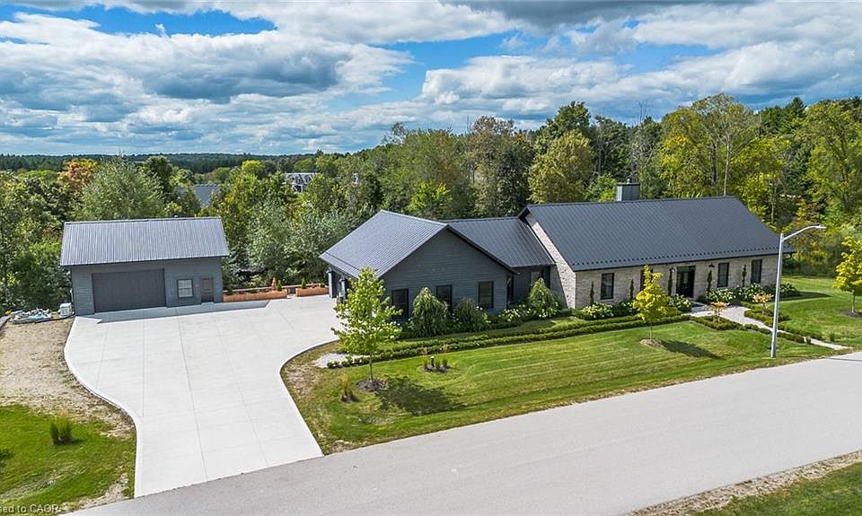 Spectacular Custom-Built Bungalow with Walk-out Basement, Triple Car Garage & Detached 2-Storey Garage & Shop on Two Acres—just 35–45 min from Waterloo! Nestled in an exclusive enclave of executive homes in Moorefield, this property offers a peaceful country setting with easy city access. Built like no other, it showcases structurally superior ICF (insulated concrete form) construction & a lifetime metal roof—the same quality extends to the det garage. Inside, the open-concept layout features exposed timber-frame details, soaring vaulted ceilings & 2 glass garage doors that open onto a 3-season porch.The kitchen, dining & living area impress w/ a stone f/p, concrete counters, oversized island & fantastic walk-in pantry w/ floor-to-ceiling storage. At its heart: an 8-burner Wolf gas stove, double ovens & upgraded range hood—over $40,000 in luxury appliances! Entertain year-round w/ the screened porch, complete w/ outdoor kitchen, brick hearth & fume hood for your bbq. The main floor also boasts a stunning primary suite w/ walk-in closet, spacious dressing rm & spa-inspired ensuite. A 2nd bedroom, currently an office, offers lovely treed views. A stylish mudrm, laundry rm & powder rm w/ live-edge barn door complete the main level. The fin w/o basement features heated floors, 2 bedrooms, 4-pc bath & expansive rec spaces—perfect for family gatherings or games night. 2 more w/o garage doors lead to the backyard & patio. For hobbyists, the 3-car gar is wired for an EV, while the sep insulated 2 storey wrkshp w/ electrical & wood stove provides endless options for projects, vehicles or gym. The nearly 2-acre property incl a pool-sized lot, new tiered deck, firepit area, treehouse & almost an acre of forest w/ a creek running through it. Your own private retreat!