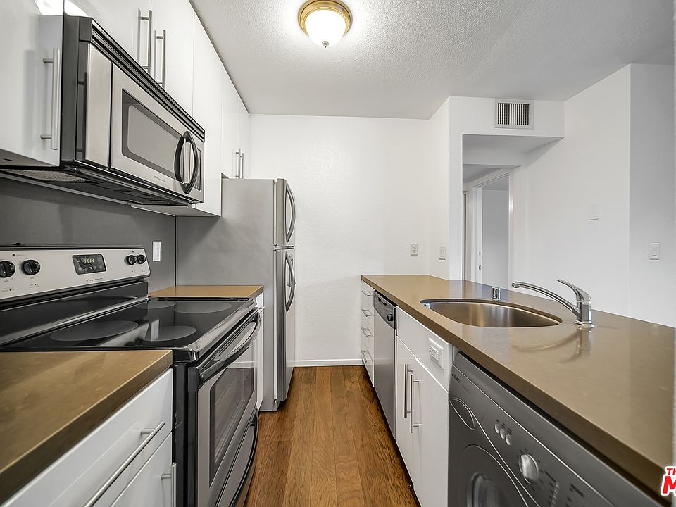 Welcome to the Rob Clark! Located in Beverly Grove (between Beverly Hills and West Hollywood) you will enjoy coming home to this chic 1BR/1Bath + sitting area condominium. Situated near The Beverly Center, Cedars Sinai, The Ivy and several other trendy spots this condominium is in one of LAs finest walking neighborhoods. The stunning building entry has a boutique hotel feel. This beautifully appointed unit has all the features including upgraded kitchen with stainless steel appliances and European combo washer/dryer. It has an added custom built-in desk with lots of EXTRA storage. The stacked glass fireplace creates a cozy ambiance. You can also enjoy sunny days on the patio balcony. There is hardwood flooring throughout. The bedroom is complete with a large walk-in closet and en suite bath including glass tile shower/tub. Building amenities include lap pool and fitness gym as well as a BBQ area and dedicated parking in a secure garage. Central air and heat Low HOA fees