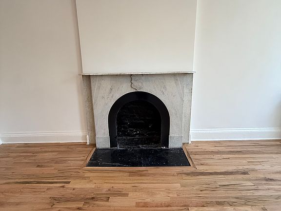 The layout offers grand proportions with high ceilings, beautiful hardwood floors, and a stunning decorative marble fireplace mantel that anchors the front room. The newly renovated kitchen features custom cabinetry, sleek finishes, and a washer/dryer. The bathroom has also been fully updated with clean, contemporary design.