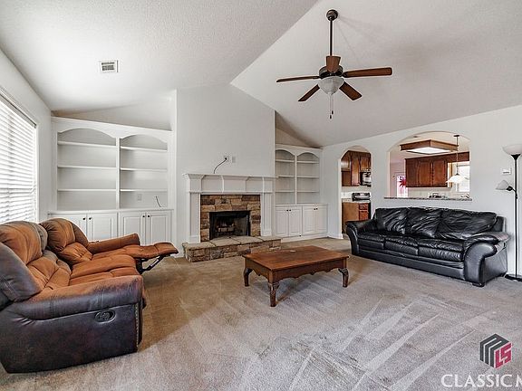 Nestled on a desirable corner lot, this move-in-ready home boasts recent upgrades including a newer roof, newer HVAC, and fresh paint throughout both the interior and exterior. Upon entry, you're welcomed into the living room featuring a stacked stone fireplace and built-in cabinet surround. The semi-open floor plan offers seamless views from the living room to the dining area and a kitchen that has been updated with new luxury vinyl flooring and sleek granite countertops. Down the hallway, you'll find three spacious bedrooms and a hall bathroom with granite countertops. The oversized owner’s suite provides a peaceful retreat with a walk-in closet, a soaking tub, a separate shower, and dual vanities in the en-suite bathroom. The flexible floor plan also includes a private 4th bedroom or office, located on the opposite side of the home near the kitchen. Additionally, this end of the home features a convenient bathroom, laundry room, and exterior access to the rear yard. The rear yard is ready for relaxation or entertaining, with a patio just off the kitchen, plus a storage shed for added convenience.