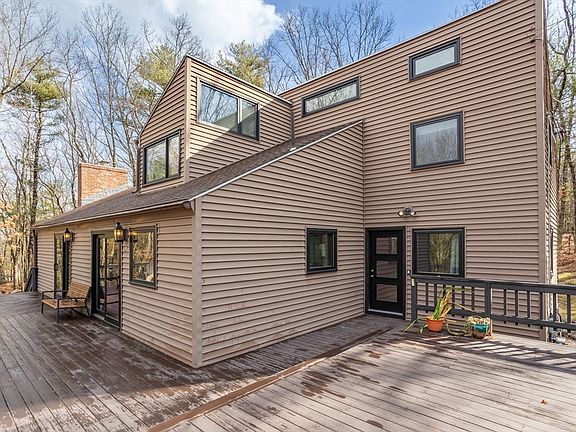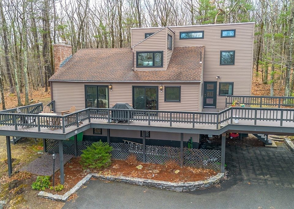This custom 3-bed, 1.5-bath contemporary home on 1.25 acres abutting conservation land blends modern upgrades, unique charm & breathtaking Western-facing views of Mt. Wachusett. The oversized living/dining area boasts expansive vaulted ceilings & a Pela Window slider leading to a huge steel beam-supported deck, perfect for entertaining or future expansion. A spacious family room with deck access enhances the flow. Enjoy a repointed fireplace (’24), new hardwood floors, newer SS appliances & Marvin windows throughout. Two bonus rooms on the 1st floor & an office upstairs offer versatility. A fully remodeled bath & all-new plumbing (2024) provide peace of mind. The partially finished basement allows for additional storage or living space. Offering privacy, modern updates & stunning views, this rare Bolton gem is move-in ready. Don’t miss out—Schedule your tour today!