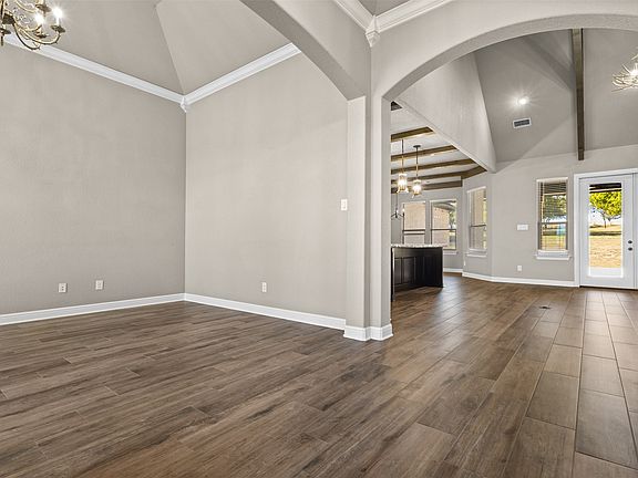 Step through the arched front door into soaring ceilings framed by rustic wood beams and an impressive stone fireplace that anchors the great room. Natural light pours through large windows, illuminating the rich wood-look tile flooring and spacious open flow. The gourmet kitchen features concrete countertops, custom cabinetry, designer backsplash, a farmhouse sink, and an oversized island perfect for entertaining family and friends.