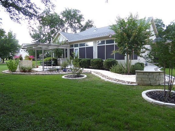 This beautifully maintained Brazos model sits on a heavily treed lot. Great street appeal is created by its side entry garage and wrap-around porch. Other features include fireplace, expanded utility room with sink, glass enclosed sun room, crown molding, plantation shutters in some rooms, bay window in master bedroom. New AC April 2015, new roof 2013 and new water heater in 2011. Beautiful extended stone patio with stone bordered flower beds and pergola. Solar screens on sun room windows.