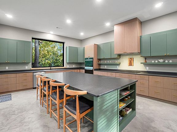 Stunning modern nestled into a hillside among the trees. This gorgeous home is surrounded by woods on all sides, with towering windows that bring natural beauty in to the living spaces. The custom kitchen has a double oven, convection cooktop, eat-in island, and a second sink for prep or coffee station. The living and dining areas are vaulted and surrounded by windows. A half bath is just off the living room. Adjacent to the living area is a fully-insulated media room with built-in ceiling speakers and in-wall subwoofer box. There are two additional flex rooms which can be used for office, hobby room, or additional bedrooms. The primary suite and junior suite both have an attached full bath and walk-in closet. The 3-car carport is attached and also serves as the roof to the 925sqft heated and cooled basement, which is a safe room and can be accessed from inside and outside the home. Additional features include Anderson casement windows throughout, a highly efficient Rudd HVAC system, instant water heaters, and a car charger. The home is built in the center of 5.47 acres. A wet-weather creek with cascading rock ledges runs to the East of the house. Trails wind around the property.