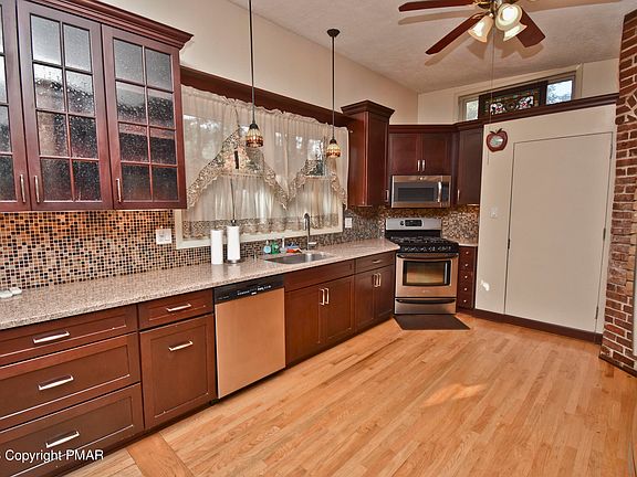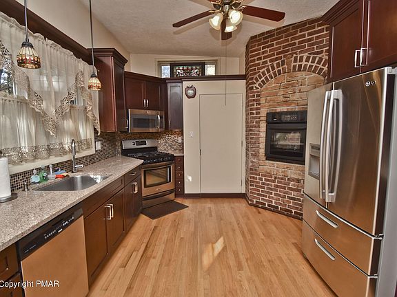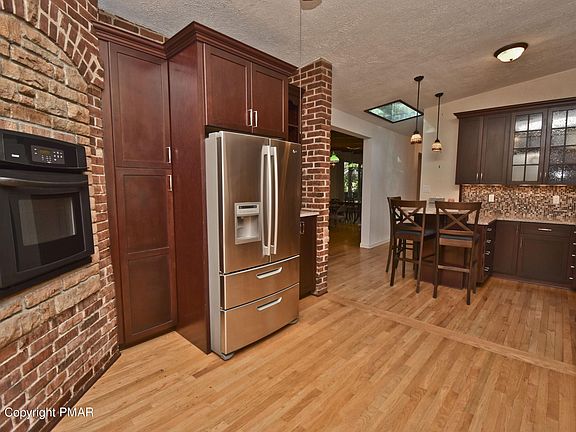 CUSTOM STONE Contemporary Ranch w/ Gazebo & 4 patios on 1.19 acres in Mt Pocono. Original Hardwood floors flow through the REMODELED CHEF'S KITCHEN that has Cherry Cabinets, Brick Accent Wall w/ Built In Oven, Quartz Countertops. Living /Dining Combo has a FIREPLACE & Handcrafted Wood Shelves. Primary Suite has a private staircase to lower level, WIC, 2 Built-in Dressers, BALCONY, & Ensuite w/ Jacuzzi Tub & Sep Shower. 1st floor also has a LARGE bd next to bath w/ WALK-IN TUB. FINISHED WALKOUT LOWER LEVEL has 3bds, REMODELED bath, & Family Room w/ LARGE WET BAR & STONE FIREPLACE w/ Wood Stove. This home also has an OVERSIZED 2 CAR DETACHED GARAGE w/ walkup storage, Shed, & Natural Gas Heat.