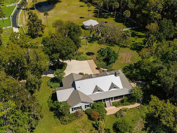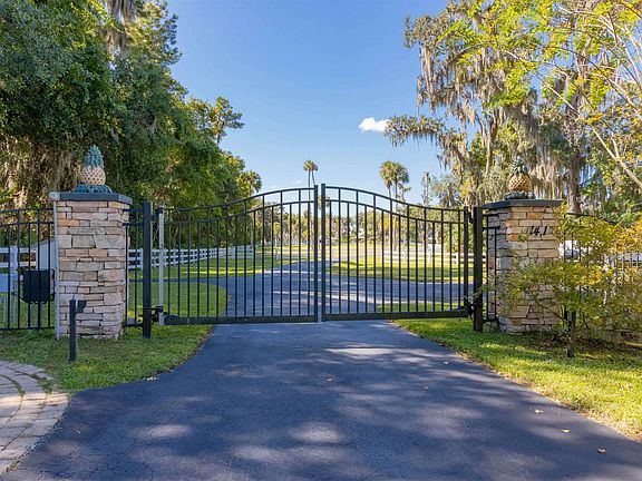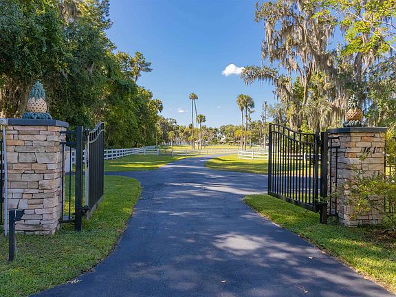 GORGEOUS RIVERFRONT CUSTOM HOME ON 22 ACRES WITH 1,729 FEET ON THE ST JOHNS RIVER! Gated entry with long winding driveway where you will pass 2 barns (a 2 stall & a 3 stall), 3 gated fully fenced pastures leading to a spectacular 2BR/2BA with den, 2402 SF home on the river with a boat dock that includes a boat lift & 2 jet ski lifts to store your Hurricane boat & your 2 Honda jet skis that come with the home! This home is being offered fully furnished & includes all furnishings. Not only do you get a boat & 2 jet skis, you'll also get an electric golf cart, Kubota Tractor riding mower, shed full of tools, a chicken coop & much more. Circular driveway leads to wrap around porch with teak wood deck & a summer kitchen. Enter into the Great Room to beautiful high wood ceilings with wood beams, clerestory windows, magnificent stone fireplace & 4 sets of French Doors leading to the wraparound porches. Owners wanted a "glorified cabin" with views from every room. Rich wood parquet flooring throughout. Spacious kitchen with lots of cabinets & counters, breakfast bar, gas stove & views of the river. 2 hallways with wood molding. 1 hallway leads to pantry & huge 12x12 laundry rm with lots of cabinets & counters, large sink & door to the front wraparound porch. Other hallway leads to double French doors to owner suite with many windows for tranquil river views, huge bathroom with river view & walk in closet with 2 gun safes, plus a private sun porch filled with more tranquil river views. The 2 stall horsebarn is in a gated fenced pasture with a pond & a chicken coop. The 3 stall horsebarn also has a carport for your own Hurricane boat. Views are breathtaking!! Across the river you will see Ocala National Forest, Hog Island and Drayton Island. This is truly PARADISE!