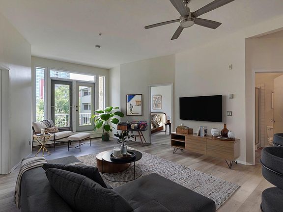 Newer era condo buildingHigh ceilingsOpen-concept floor plansBright and airy kitchenEast-facing balconyLooks into the courtyardNew laminate flooring