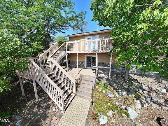 This unique home is tucked into the hillside in NE Mandan with easy access to downtown and Interstate. The home offers 2 living and kitchen areas so could be used as a duplex (checking with city on zoning)or a single-family home. The main floor has a living room open to the kitchen and dining area. The kitchen has original painted cabinets and there are two bedrooms (1 non-conforming) and bath on the main. The upper level features an updated kitchen, a spacious living area with and 2 more bedrooms with original hardwood floors and a full bath. There has been newer carpet installed recently in the living room. There are awesome views of the city from the spacious wrap around deck off the upper living room area. There are stairs leading up the deck if used as a duplex. There is a storage shed in the backyard. The lot is large at 16,100 square feet so a driveway and/or garage are possible on the east side of the home. This home offers lots of possibilities!