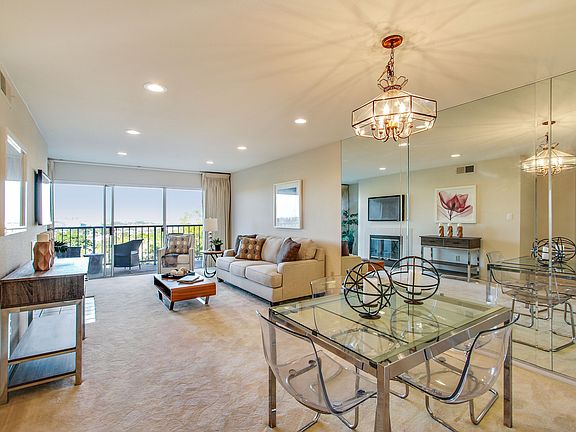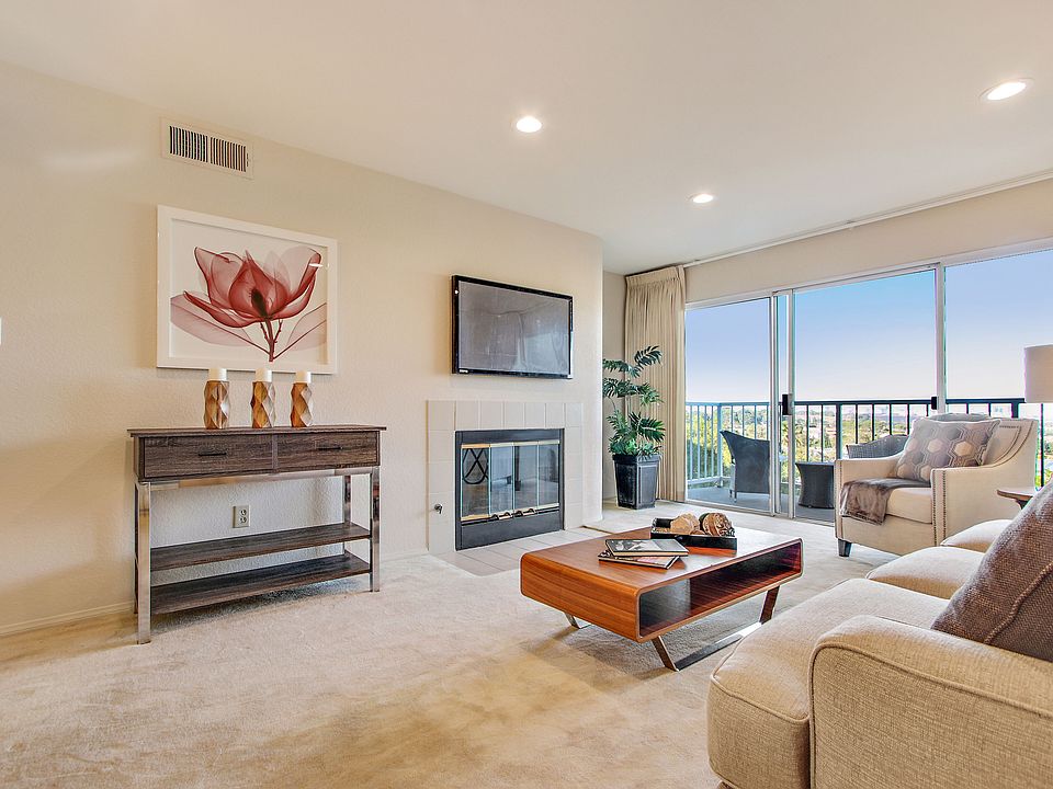First time buyer? Downsizing? Here's a prime opportunity to live in a gated complex in a move-in ready super-sized 1 bedroom condo! This bright and airy 864 sq. ft. unit has just been freshly painted, and has brand new laminate flooring and baseboards in the main living areas and bedroom. The kitchen has plenty of cabinet and counter space, and all appliances are there - stove, microwave, newer dishwasher, and LG refrigerator-all included! The dining room has a wall of mirror to reflect the VIEW from the living room balcony! The living room features a gas fireplace, smooth ceilings, and recessed lighting. You'll get a good night's sleep in the spacious bedroom with view of the night lights and greenery. There's storage galore with a wall closet with mirrored doors AND a walk-in closet too! The bathroom features double sinks, a walk-in shower with glass doors, a soaking tub and a laundry closet with stackable washer/dryer. The large balcony is a great place to sit and gaze at the pastoral view, enjoy your morning coffee or a nightcap! The complex has recently undergone a major renovation with new landscaping, new paint, wood repairs and more. A sparkling pool and spa are there for your enjoyment as well. This unit comes with TWO SIDE-BY-SIDE parking spaces in a gated parking structure. Unit is well located near the elevator and also has a private storage closet. . This complex is FHA and VA approved, so bring your offer and be in for the holidays!