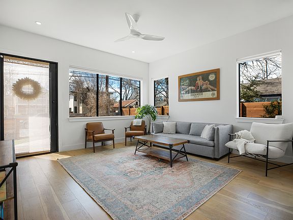 Located in the heart of vibrant East Austin, this home is ideally located for those who want to be close to all that Austin has to offer. This Eastside home is walking distance to some of the best new restaurants in the country, incredible bars, a historic live-music venue, and a bike ride to the river. Convenience meets comfort only one block from the Saltillo shopping district (Whole Foods and Target), and steps away from fabulous restaurants, cocktail-bars, entertainment venues, major employers, shopping, and easy access to the light rail station and Downtown Austin. Constructed in 2019, this stunning contemporary is sun-drenched and beautifully appointed with open living spaces, high-end finishes, and ultimate functionality. The main level features the living room, dining and kitchen, with an elevated powder room, ample space to entertain graciously and direct access to the front and back patios, side french-doors and the newly renovated yard. Three spacious bedrooms, make up the second and third floor, each with their own full en-suite bathrooms and private balconies. The top floor functions as a live and work space, with amazing skylights, and also with its own dramatic balcony with views of the downtown skyline. Another flexible space is located in the chic, recently renovated basement with a wet bar and wine fridge. This space also captures an abundance of natural light, and perfectly functions as a comfortable additional living room and guest bedroom. A recently renovated nursery off the master bedroom also functions as a dedicated home office. Surrounding the home you'll find a fully-renovated yard, complete with three-zone irrigation system, featuring 4 beautiful olive trees, honeysuckle vines, custom trellising, 3 fruit trees, Texas Sage plants, and other drought-friendly plants. A two-car driveway, and a one-car garage that features top-of the line home- gym equipment. The home is surrounded by a custom built fence, with an automatic ipe-wood gate for cars and a pedestrian entrance. Live in the middle of all that Austin has to offer at 1410 E 3rd!