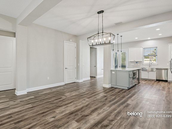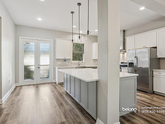 Just beyond, the kitchen impresses with its grand island, smooth countertops, and sleek stainless-steel appliances. White cabinetry and pendant lighting add a polished touch, while the layout makes cooking and gathering feel effortless.