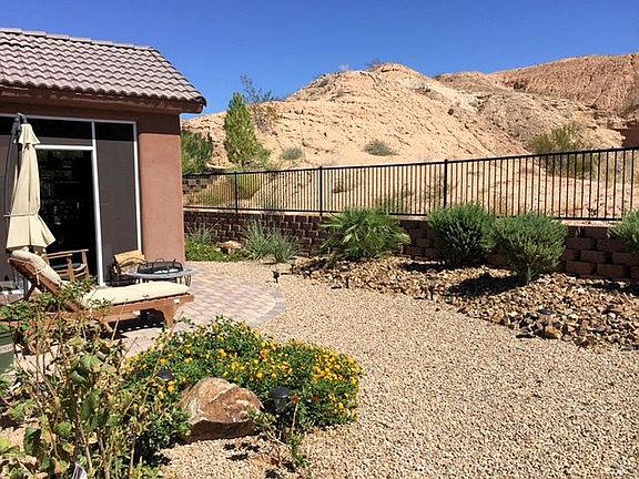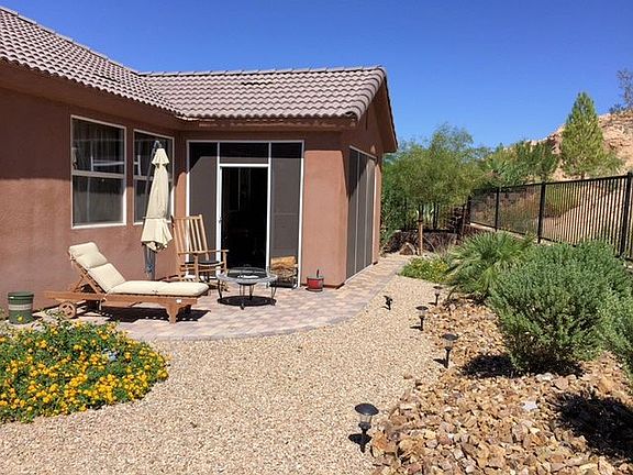 This well appointed home is located in St. Andrews, a desirable community surrounded by the Canyons Golf Course. The home is situated on a spacious lot and backed by a natural desert bluff. The yard is beautifully landscaped and fully fenced. Choose one of three areas to enjoy the outdoors year round. The screened in back patio leads to an attractive Paver sitting area. The breakfast nook opens up to a covered court yard on the side of the home that is completely private and screened. This open floor plan has 3 bedrooms and a den. The kitchen is gorgeous with an impressive wall of cabinets, granite counter tops and stainless appliances. The room sizes are generous and the ceilings are high. The master bathroom has a granite top and beautiful tile surround. Tile floors run throughout the home in the traffic areas and the paint tones are warm. The window treatments, water softener, garage cabinets and the home security system are a bonus. THE SID IS PAID IN FULL.