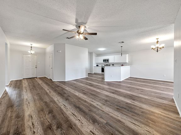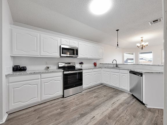 Thoroughly updated recently with: all flooring, carpet in bedrooms, luxury vinyl plank everywhere else, granite countertops in kitchen and both bathrooms, tile kitchen backsplash, all sinks and their faucets, paint on walls and cabinets, stainless appliances, including stove, microwave oven, and dishwasher, some lights, and some ceiling fans. Hot water heater replaced in 2024. Fresh epoxy coating on double car garage floor. Primary bedroom has a large walk-in closet. Covered back porch overlooking small back yard. Quiet neighborhood in convenient location.