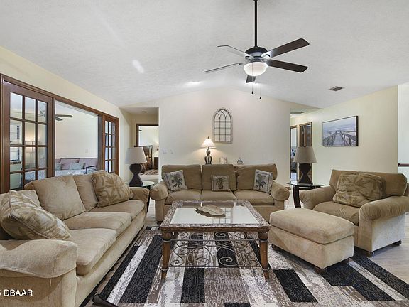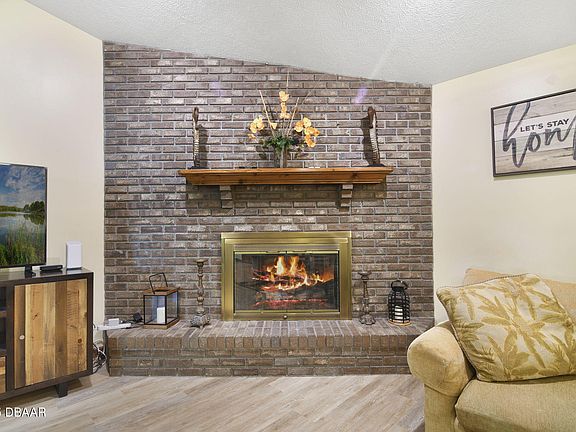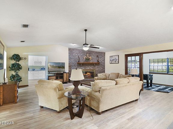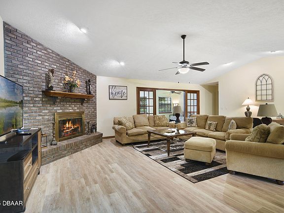 Experience Florida living in this beautiful 3-bedroom, 2-bath residence with an oversized 2-car garage. Set on a generous fenced lot with a charming in-ground pool. Step inside to discover an inviting open floor plan enhanced by luxury vinyl plank flooring, vaulted ceilings, and a beautifully detailed brick fireplace. The gourmet kitchen is a chef's dream, showcasing elegant white shaker cabinetry, granite countertops, and ample space for both dining and entertaining.