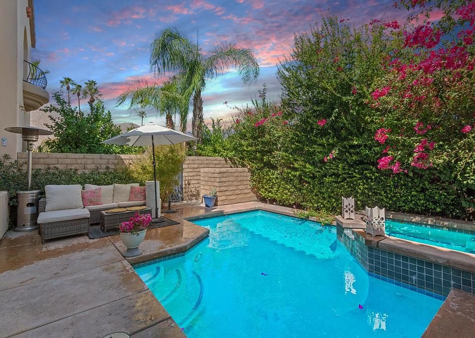 Truly stunning 3 bed, 3 bath condo with private in-ground pool and spa! This home features soaring ceilings, hard wood and tile floors, recessed lights, and gorgeous mountain views. Enter into the great room where the living room, dining area, and kitchen come together, perfect for hosting with a slider to the backyard retreat and open concept floor plan - great for indoor/outdoor entertaining! The kitchen offers granite counters, wood cabinetry and stainless steel appliances including the refrigerator, gas range, microwave, and dishwasher. A bedroom, a bathroom with walk-in shower, and a large laundry room with included washer and dryer complete the main floor. This delightful home features 2 primary suites, both on the 2nd floor. The larger primary suite has a walk-in closet and the ensuite features dual sinks and a walk-in shower. The 2nd primary also has a private bathroom with tub/shower combo. Enjoy the gorgeous backyard with lush landscaping framing the in-ground private pool and spa and space for your own loungers or patio set! This home also has an attached 2-car garage with direct access to the home, and an additional guest space. Residents also get to enjoy a greenbelt area, 2 community pools and spas, as well as lots of privacy with gated access! Conveniently located just a minute from Downtown Palm Springs and the Spa and Casino, as well as shopping, dining, golf courses, and more!