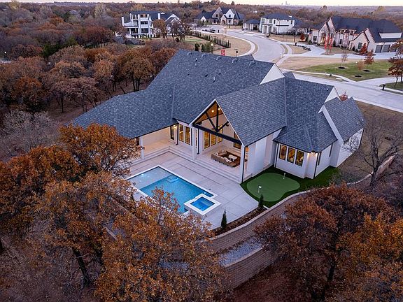 Tucked within the exclusive, gated enclave of Shoreline, just south of Lake Arcadia, this breathtaking estate blends timeless architecture with curated luxury. On an acre of land, the home offers 5 spacious bedrooms, including a private mother-in-law suite, alongside a dedicated gym, a separate study, and a large upstairs bonus room, all thoughtfully designed by the highly regarded Kirby Home Designs to accommodate both everyday living and elevated entertaining. From the moment you arrive, the home commands attention with its Belmont shingles and cast stone accents. Inside, the attention to detail continues with Visual Comfort lighting throughout and a refined palette of wood, marble, limestone, and tile flooring. The chef’s kitchen is a true showpiece, featuring a La Cornue range, panel-ready appliances, and a nugget ice machine, all seamlessly integrated into the custom cabinetry and butler’s pantry. The kitchen also includes coffered ceilings and archways that echo the home’s architectural sophistication. Nearby, a stunning glass-enclosed wine rack and a gorgeous wet bar offers a dramatic space for entertaining. The mudroom includes marble countertops and five custom drop zones. The primary suite is equally impressive, featuring his-and-hers closets that maximize both function and luxury. Plumbing fixtures throughout the home include high-end selections such as Newport Brass, Brizo, Kingston Brass, and Delta. Soaring 14-foot ceilings in the living room and 12-foot ceilings in the kitchen amplify the sense of space and light. Wall-to-wall windows in the living and dining rooms overlook a 30’ x 16’ resort-style pool, surrounded by layered landscaping, an outdoor kitchen and a covered patio with a fireplace. From the pool area, a beautiful view is seen over the remainder of the acreage. Every finish and fixture in this home was selected with precision and style making it exceptionally livable and undeniably luxurious.