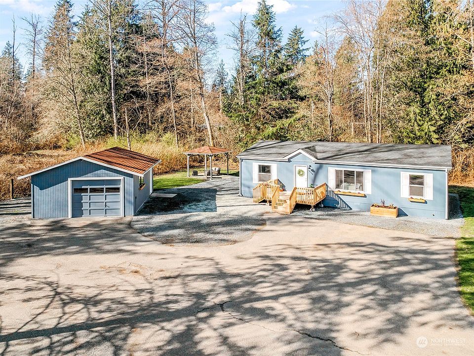 [A MUST SEE] This adorable NEW home offers main level living; featuring 3 bed + 2 bath, thoughtfully designed for comfort and convenience. The kitchen boasts new SS appliances, ample storage and provides both a breakfast bar & a cozy dining nook. Enjoy the generous sized primary bedroom with a WIC & bathroom. Step outside & soak up the morning sun on your front deck + room to BBQ on your back deck. You'll find tranquility under the gazebo, offering an ideal spot for outdoor entertainment. Detached garage ensuring ample space for all your storage needs, hobbies & parking. NO HOA, partially fenced, secured gated entry on 1/2 acre. Take advantage of country living just minutes from town - Close to trails, lakes & easy commute.