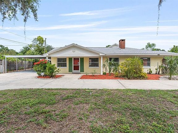 One or more photo(s) has been virtually staged. Discover this stunning home offering over 2,000 square feet of bright, thoughtfully designed living space. Nestled on a spacious corner lot, with a wrap-around driveway that enhances curb appeal and offers convenient access from two streets—perfect for accommodating guests, extra vehicles, or easy daily traffic. Inside, you'll find a welcoming open-concept layout featuring updated flooring, ceiling fans, and built-in conveniences that blend charm with functionality. The charming kitchen provides abundant counter space, modern appliances, and seamless access to the dining area—an ideal setup for both everyday living and entertaining. A large laundry room adds extra storage and practicality for busy households. Step outside to enjoy the fenced backyard, perfect for pets, gardening, or weekend barbecues. Features mature landscaping, including several fruit trees such as mango, avocado (currently producing), and orange trees. Offering the enjoyment of fresh, homegrown produce. Additional amenities include two detached storage buildings suited for tools, hobbies, or a workshop. The oversized driveway and covered carport deliver ample parking for guests, boats, or recreational vehicles. Situated in the peaceful, well-established Hannum Heights neighborhood, this home is just minutes from downtown Eustis, East Crooked Lake, and local schools. With no HOA and a flood zone X rating, it offers peace of mind and a wonderful community to call home. Whether you're a first-time buyer, growing family, or seeking single-level living packed with character, this exceptional property truly checks all the boxes.