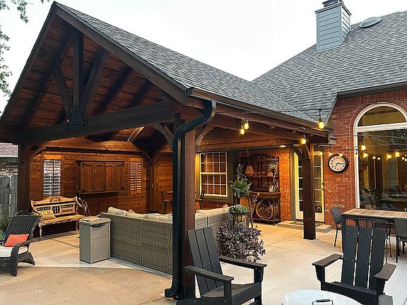 Enjoy the natural sunlight year-round with floor-to-ceiling arched windows overlooking a one-of-a-kind view including a heated pool and patio with a stunning outdoor pavilion and tree backdrop. All new flooring, paint and stainless appliances including built-in double oven and gas cooktop. Open floor plan. 12 ft ceilings. New Class IV roof. Custom wood interior shutters. Double-sided fireplace in primary bedroom/bath. Oversized garage with shop and tandem door. Sprinkler system. Storm shelter. Fenced backyard with outdoor shed. Absolutely move-in ready plus neighborhood is one of the best.
