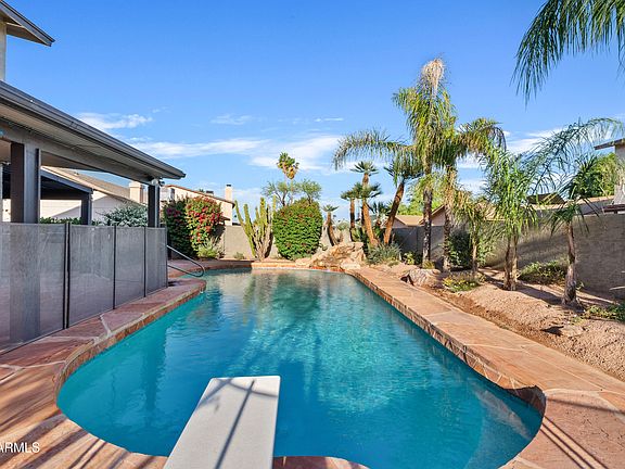 Beautifully appointed 4 Bedroom Home with Backyard Oasis in Dobson Ranch! This home was meticulously maintained with pride of ownership that shows! As you enter through the double doors you will enjoy the warm wood flooring downstairs and brand new carpet upstairs. The vaulted and sunken formal living room is spacious and opens to the formal dining room which has french door access to the side covered courtyard. The kitchen is light and bright with dual pane vinyl grille windows, gray shaker cabinets with SS pulls, Brazilian polished White Ice Granite, Kitchen Island and SS appliances. The family room features a white wood burning fireplace and mantle as the focus point and grille pattern slider door to the patio. The primary bedroom is spacious and features twin closets and updated... bathroom with walk in travertine shower and double vanity with granite top. The backyard is lush with beautiful mature shrubs bursting with spring colors, an assortment of palm trees, cactus, and the landscape lighting makes it feel incredible at night. The diving pool has a peaceful trickling water feature and is surrounded by flagstone that extends to the private side yard and outdoor cooking station. The laundry room is spacious with lots of built in storage, water softener loop, and exterior access door. Other features of the home include removable pool fence, newer dimensional shingle roof, large storage shed in backyard, updated electrical outlets and switches, updated trim and much more! The Dobson Ranch community has 4 pools, a splash pad, a public golf course, remodeled Library, biking paths, a clubhouse/rec room, playgrounds with 2 basketball courts, 8 New Pickleball and Tennis Courts, and 8 beautiful catch-and-release lakes with plenty of room for boating and kayaking. This home is minutes from the US60 and Loop 101, with great schools and shopping close by. You won't find a better-maintained home in all of Dobson Ranch! Come see this home today before it is gone!