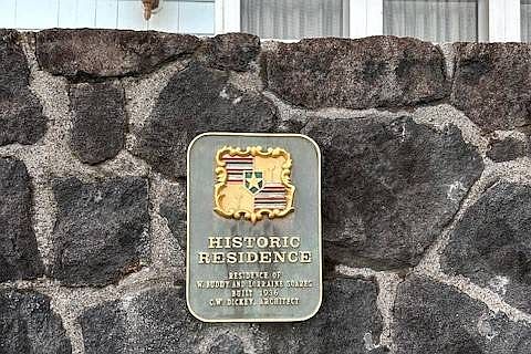 Large 2-story Classic home on the State Historic Registry built in 1936. C.W. Dickey architect. Tax-exempt status. Located above Hilo Medical Center in Piihonua - "silk-stocking" district of Hilo w/other classic homes. Beautifully-landscaped w/hedges lining the winding driveway to the porte cochere/carport. Kitchen w/glass cabinets & island, stainless steel sink/counter, vinyl flooring w/pretty design. Former maid's quarters bathroom adjacent to kitchen and large den (originally laundry/utility room). Garage enclosed for a 4th bedroom or recreation/family room. Dining area/room w/beautiful chandelier & hardwood floors and a little lanai right outside. Spacious living room w/fireplace & powder room, wine cellar/storage, library, spiral Ohia staircase to 2nd floor, bedroom w/ocean & yard views, master bedroom w/ocean views & study area. Concrete slab for teahouse exists. Variety of fruit trees on property (avocado, lime, jabon, papaya, coffee, sweet potato, pineapple, mountain apple, mango (no fruit yet). Nice neighbors. Take the virtual tour. Welcome to gracious living in your Historic Home!