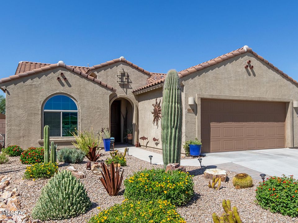 Gorgeous! Premium golf course lot on a quiet cul de sac! 1st time on market. 2019 built 2-bed, 2-bath residence. Vail's Rancho del Lago 55+ community! 2.5 car extended garage. Professional designed landscaping. Open floor plan. Tile flooring, natural light, custom built-in media center, surround sound. Premium granite counters. Gourmet's kitchen. ALL stainless steel appliances + washer/dryer convey. Turnkey! Walk-in pantry, tile backsplash, custom cabinetry, crown molding. Rich primary bedroom. Luxury wood-look plank flooring. Large bathroom. Walk-in closet. No neighbors in front or back. Private sanctuary backyard: covered patio, pavers, custom privacy fencing. Lush natural desert complements this on-the-golf-course lot. Please schedule your showing today