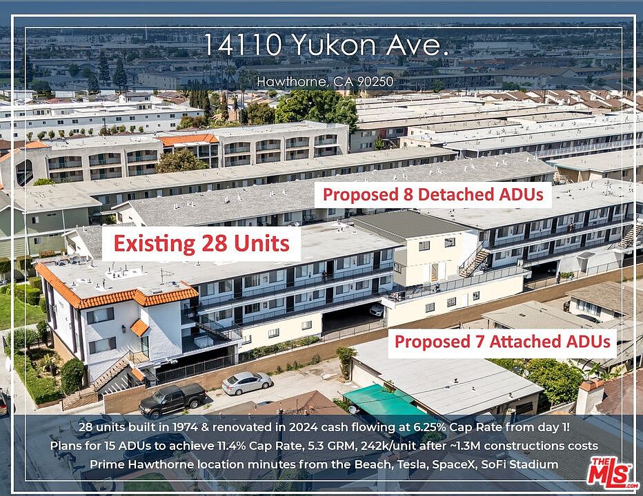 Huge 600k Price Reduction! Newer 28 units built in 1974 & Renovated in 2024 cash flowing at an amazing Current Cap Rate of 6.5% from day 1! Preliminary plans to add 15 ADUs to achieve an incredible 9.2% Cap Rate, 8.2 GRM, and only 235k/unit after taking into account all the construction costs (~1.3M assuming $250/SF). The preliminary plans call for 7 attached ADUs in the garage/storage area + 8 detached ADUs over the pool area while still maintaining ~20 parking spaces for the residents. Excellent unit mix consisting of 4 (2bed/1bath) units and 24 (1bed/1bath) units. Majority of the units have been completely renovated and boast a high-end aesthetic with new modern cabinets, flooring, lighting, new bathrooms, stainless steel appliances, and major exterior capital improvements. Amenities include a renovated pool, on-site laundry facilities, secured entry, and ~34 covered parking spaces for convenience. Huge almost ~20,000 SF lot for future development potential. Located in the heart of Hawthorne just minutes away from the Beach, Tesla Design Center, SpaceX, Starlink, Northrop Grumman, LAX, Intuit Dome, SoFi Stadium and more.