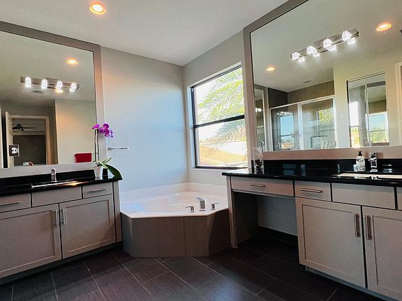 Resort style poolGorgeous lake viewTennis courtsMoen fittingsPickleball courtsCeiling height mirrorsSmooth polyaspartic floor