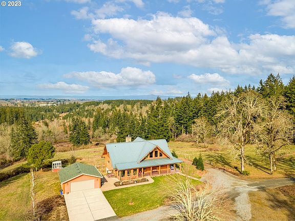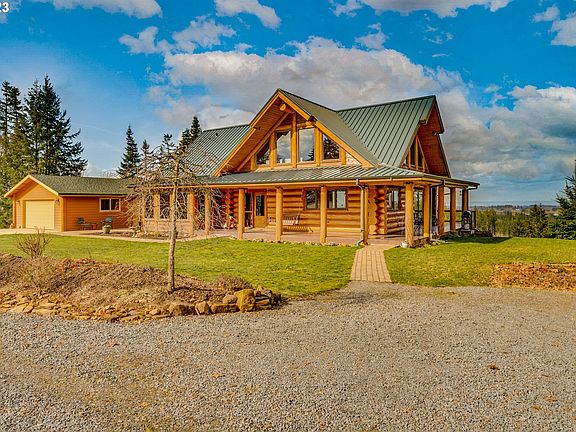 The incredible charm of a real log home plus the total privacy of 20 acres w/valley & mountain views! Natural light fills the dramatic 2 story Great Room from 2 walls of windows. Stylish kitchen w/eat bar. Primary Suite on main flr w/doors to wraparound view porch + Sun Room. Loft is spacious w/full bath. Sep LivQtr potential on lwr lvl w/2 non-conforming BDs; 1 stubbed for kitchen, and Family Rm w/slider to backyard. Multi-use Barn/Outbuilding/RV shed has 5 stalls, indoor arena, big work area.