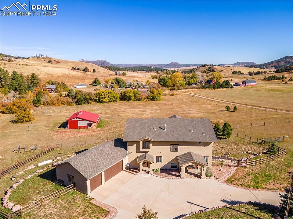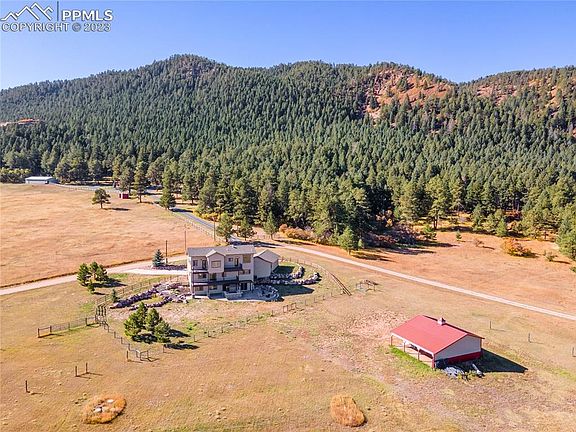 Quintessential Colorado Living on almost 8 acres of prime coveted pastures & pond for horses, furry family members, or your long-awaited hobby farm. Every window brings in glimpses to create stares toward day-to-night landscapes filled with movement and light. Off the road and nestled near the towering red mountain buttes of Perry Park, this home stands strong in stature as a stucco & wood trimmed rustic multi-tiered showplace and entertaining paradise. Inside you will find a gourmet kitchen w/top of the line appliances, great room w/raised stone gas fpl, 4 beds, 5 luxury baths, a prof finished walk-out basement, oversized 3-car garage w/4 season pet area. The front entry reflects elegance w/stained glass panels, wildflowers & pines. A paved circular driveway provides plenty of parking. Custom mudroom helps w/quick clean-ups on slate floors w/close proximity to kitchen-1/2 ba-garage. Gated fenced in area for pets & pet door from garage helps keep paws warm. Primary Bed: California Closet wardrobe + walk-in closet, floor to ceiling stone gas fpl & prvt balcony. Royal Primary Bath incls: enormous step-in jetted soaking tub w/ expansive tile surround, dbl granite vanity w/storage drawers & above counter stone sinks, water closet w/bidet, & linen closet. 2nd upper-level primary sized suite w/views, balcony & private bath. Finished basement is perfect spot for game days w/a butler styled kit, wine and beverage frigs. Rejoice w/a brand-new custom 100k outdoor kit w/thick cut granite top, Charbroil gas grilling mecca w/addl burners, SS cabs, electrical outlets galore, frig & wraparound bar that fits 30! 4th bedroom has been expertly designed for creative minds to scrapbook, sew, or use as the most organized home office & guest suite. Newer 2-stall barn & 8' sliding equipment door acreage capable for corral and riding areas. This home is a quick hop to Palmer Lake & a smooth drive to Monument creates a location that feels more like an everyday getaway. (Virtual staging)