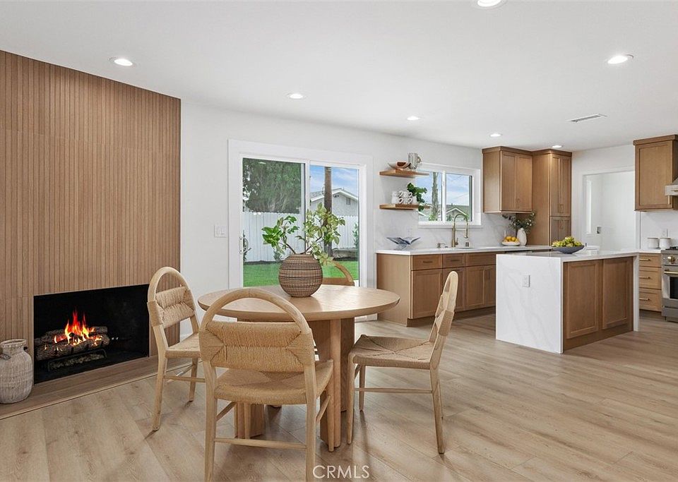 A celebration of clean lines, natural light, and thoughtful craftsmanship, this newly reimagined 1962 Mid-Century ranch-style home invites you to enjoy the best of both past and present. Situated in a charming neighborhood just minutes from Old Towne Orange, the home has been meticulously remodeled with curated finishes and elevated function—creating a space where timeless style meets today’s ease. Spanning approx. 1,469 square feet, the single-level layout flows effortlessly with four bedrooms and two baths, including a light-filled living and dining area anchored by a modern slat-wood fireplace surround. The new designer kitchen opens seamlessly to the backyard and features a dual-waterfall island, full quartz backsplash, light oak Shaker cabinetry, and high-end stainless appliances including a pro-style Zline range and drawer microwave. A spacious mudroom with laundry, cabinetry, and sink connects to the freshly finished two-car garage with epoxy floors and new door. Down the hall, secondary bedrooms are bright and functional, while the guest bath pairs timeless black-and-white tile with updated fixtures. The primary suite offers a walk-in closet and a serene ensuite with a custom vanity and walk-in shower. Throughout the home, wide-plank white oak-style LVP, recessed lighting, Shaker doors with black hardware, dual-pane windows, Nest smart thermostat, and Ring doorbell enhance both comfort and style. Outdoors, the 7,070 sq. ft. lot is equally turnkey. A new roof, fresh exterior paint, lush lawn, automatic sprinklers, and tile-finished patio come together to create a front and backyard that feel as effortless as they are inviting. Just two miles from the restaurants, galleries, and vintage charm of the Orange Circle—with easy access to parks, schools, shopping, Angel Stadium, Disneyland, and more—this is a rare opportunity to live beautifully in one of Orange County’s most cherished communities.