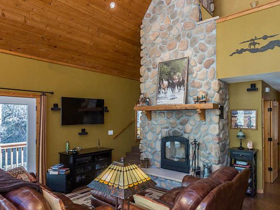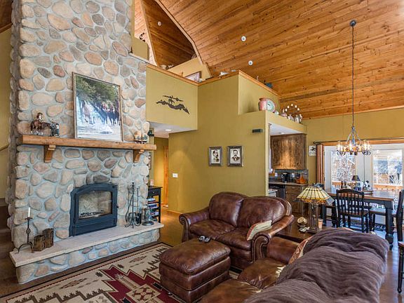 Beautiful ''ski chalet'' cabin in the pines built with the utmost care and planning. Every inch of this home has been carefully thought out during the building process. Hardy board siding, metal roof, snow shoes. Paved roads, fire dept near, 6.7 miles to dwntwn. Energy efficient construction, two catalytic wood stove fireplaces, granite counter tops, custom cabinets, tankless water heater upgraded fans. Back trex decks, boulders, tall trees, seasonal creek all provide the iconic cabin feel. Main level consists of wrap around open deck, living room, kitchen, two bedrooms and 1.5 baths. The Master bedroom loft has a private deck, office space and 3/4 bath with tile shower. Walkout basement provides a den with a fireplace, bathroom and two bonus rooms. Must see to appreciate the upgrades galor