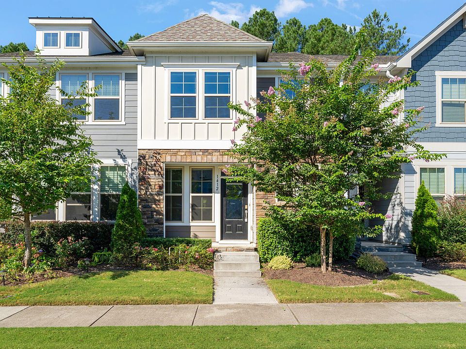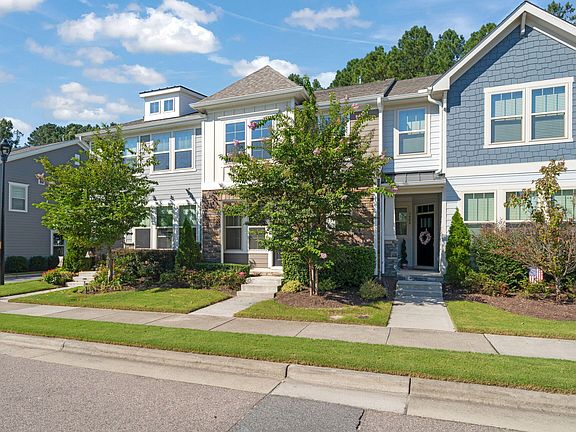 Beautiful townhome in Wendell Falls! Walk your kids to elementary school, close to shops and all Wendell Falls has to offer! New carpeting and interior paint. Entry level has beautiful, spacious kitchen with stainless appliances and eat in area. Large storage space, living room, half bath and garage access. Upper floor has primary suite with spacious bath that includes dual sinks and walk in closet, two good size secondary bedrooms and an additional full bath.