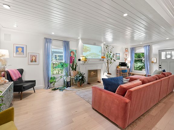 Inside, you'll find quartz-stone countertops, custom cabinetry, hardwood flooring, tongue-and-groove ceilings, designer lighting, and a cozy gas fireplace. The home features two master suites, three full bathrooms with custom tile surrounds, and smart home lighting controls. Comfort is prioritized with dual water heaters, two AC units, and two forced-air heating systems.