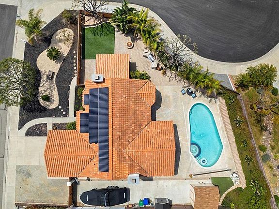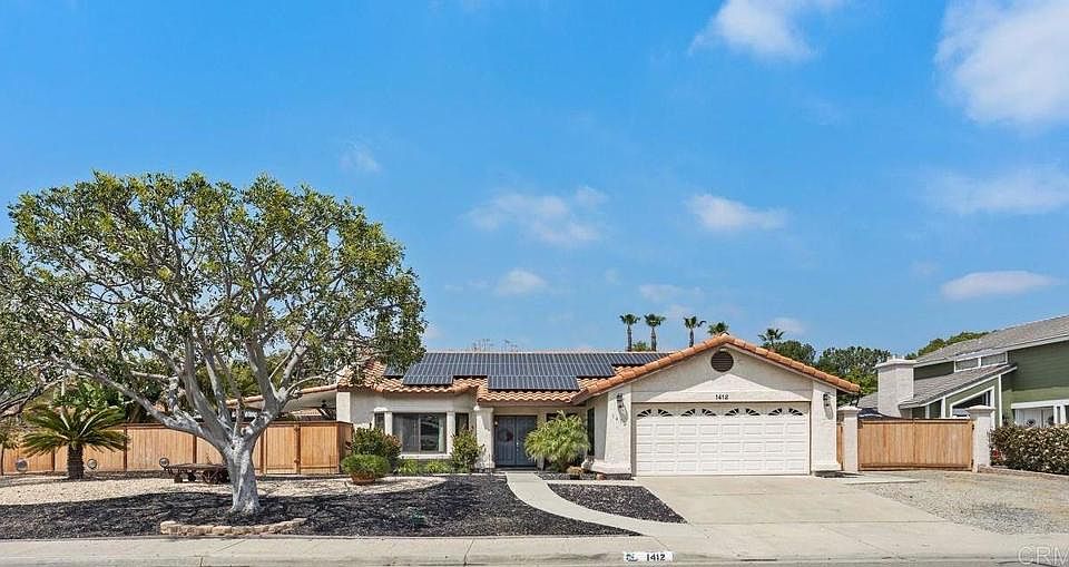 You will live in style and comfort in this stunning single level 3 bedroom, 2 bath home. It has vaulted ceilings, gas fireplace in the living room, an open kitchen and an adjacent family room with French doors. The expansive master suite provides a cozy sitting area with gas fireplace. The ensuite has double sinks, soaking tub, separate shower, enclosed lav and walk-in closet. This lovely home located near Guajome Park was designed for outdoor living. It has an in-ground saltwater swimming pool and hot tub, built in BBQ, gas fire pit, and an 18’ x 24’ covered patio with ceiling fan. The oversized lot is beautifully landscaped with low maintenance artificial turf, paving stones, brick retaining wall and an automated sprinkler system. Additional features include a fenced extended concrete driveway for secure off-street RV/boat parking with upgraded 30-amp outlet and a 10’ x 12’ Tuff Shed to store your equipment. Updates include NEWER furnace and A/C, Milgard windows & doors, bedroom remote controlled ceiling fans, and owned solar power with Tesla backup battery.
