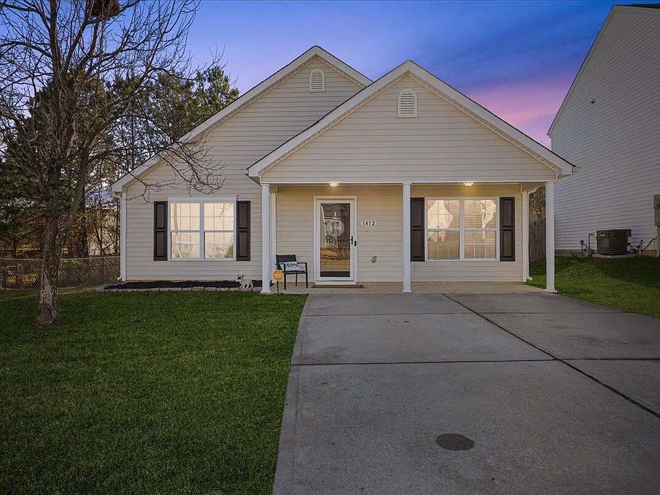 Welcome to 1412 Ricochet Dr - the cutest home on the block! This 3 bedroom, 2 bath ranch home is move in ready with SO many upgrades!! Fresh paint and carpet throughout, new kitchen countertops, new lighting, newer HVAC and water heater, and updated bathrooms. Enter into the Living Room with vaulted ceilings, a corner gas fireplace and custom accent wall. Continue into the pristine kitchen with white cabinets, SS appliances, and new countertops. Beyond the Kitchen is a Dining area with sliders going out to the back patio and private, fenced in yard with a neighbor on one side only. You'll find the Primary Suite on the left side of the home with a vaulted ceiling and new carpeting, HUGE walk in closet, and a renovated Primary Bath with a shiplap wall, double vanity, and separate tub and shower. There are also 2 other spacious bedrooms (one with an adorable accent wall) and a hall bath that has been updated - all bedrooms have brand new carpet. This property is located just south of downtown Raleigh and is close to Garner as well, with easy access to schools, shopping, restaurants, and more. All for under $300K!
