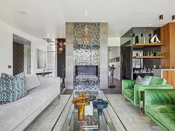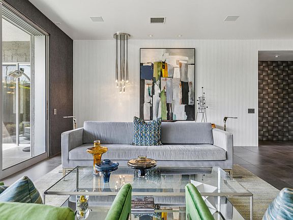 Dedicated media roomDesign forward living spaceJennair appliancesHeatilator linear outdoor fireplaceElectric patio screenMoveable window wallCustom retractable window wall