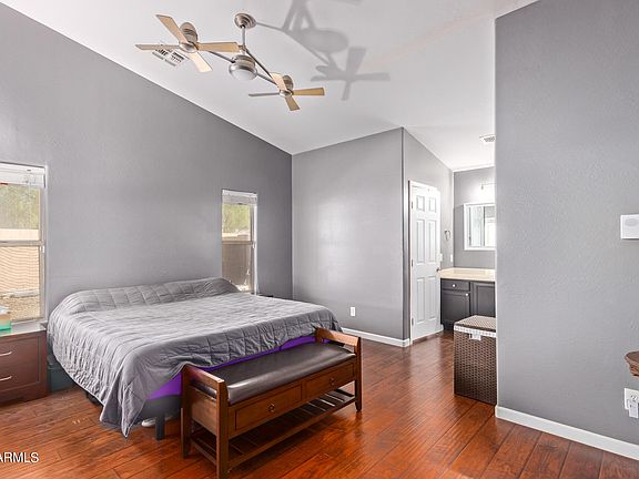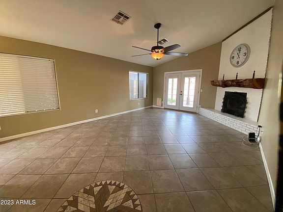 Low Maintenance, Turn Key home in Surprise. 3 beds, 2 baths, a 2 car garage, manicured landscape, and excellent curb appeal. Wood Burning Brick corner fireplace with a gorgeous wood mantle in the living room, vaulted ceilings, tile flooring, and French door access to the back. The kitchen comes complete with modern drop lighting, custom-colored cabinetry w/crown trim, SS appliances, and a sunny breakfast nook. All 3 bedrooms have wood floors! Main bedroom w/mirrored closet, and en suite with upgraded 2021 Garden tub/shower combo. Enjoy relaxing in the back covered/extended patio. Very quiet with no neighbors behind. Solar system size 11.9kWp...More than needed. Current solar is 155.13 a month. APS bill has a credit for Nov.