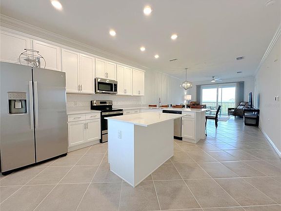Ornamental white granite countertopsHigh-end upgradesDiagonal tile flooringCrown moldingStainless steel appliancesWhite shaker cabinets