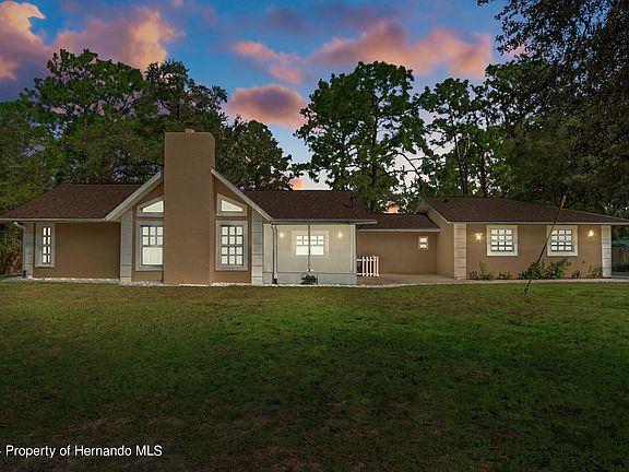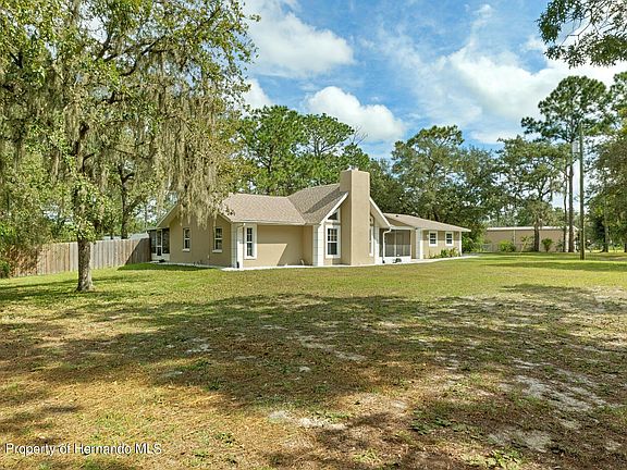 Active under contract accepting back up offers.... This amazing secluded property offers a perfect blend of modern amenities and serene outdoor living. There are 1.8 acres zoned AR2 so bring the horses with no deed restrictions or HOA reastrictions. As you step inside this beautiful three bedroom, two bathroom home you are greeted by an inviting open floor plan that seamlessly connects the living, dining, and kitchen areas. The exterior of the home is freshly painted in 2023 and there is gorgeous ceramic tile and vinyl plank flooring throughout. In 2022 the roof was replaced with a 30 year three dimensional shingle roof, the owner installed a new well pump, well pipe, bladder tank, pressure switch and wiring in 2022, there are upgraded gorgeous new sliding glass doors, new septic drainfield was installed in 2021, the hot water heater was replaced in 2020 and a new Carrier AC unit was installed in 2017. The kitchen is a chef's delight, featuring an abundance of beautiful cabinets, stunning granite countertops and backsplash and top-of-the-line LG stainless steel appliances, including a brand new, quiet LG dishwasher. There is ample storage space with a built in pantry and a functional layout that makes meal preparation a breeze. The master suite is a true retreat, boasting a gorgeous master bathroom complete with a luxurious Jacuzzi tub, a separate snail shower, and dual sinks for convenience. The guest bathroom features a tub-shower combo, ensuring comfort for family and visitors alike. Cozy up on those cooler evenings by the wood-burning fireplace in the living area, which adds warmth and charm to the home. For those who love the outdoors, the 30 X 12 screened lanai provides a perfect spot for relaxation and entertaining... all while overlooking a park-like backyard adorned with various fruit trees, offering both beauty and tranquility. The back yard does have wood fencing and a separate chain link fenced area including a chicken coop. Additional highlights of this remarkable property include a two-car garage equipped with a brand new quiet Genie belt drive garage door system, ensuring effortless access. The property is located close to shopping, dining, schools, and minutes to the SunCoast Parkway. This property is a rare find, offering the perfect combination of space, comfort, and outdoor enjoyment. Don't miss out on this opportunity to own a slice of paradise for only $389,900 !!