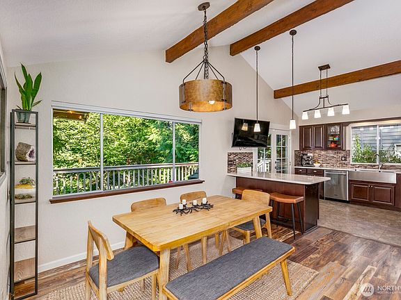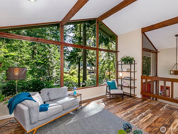 Welcome to this wonderful home in highly desirable Picnic Point. Nature lovers rejoice in this home set amongst the trees, backing to a green belt. Huge floor to ceiling windows & warm interior tones blend with the setting. Multiple French doors open to a full length back deck, outdoor entertainers come hither for the outdoor living space & hardscape complete with bar, TV & firepit. Meanwhile inside, this home features updated kitchen open to living room w/vaulted ceilings and plenty of windows. Downstairs has an awesome rec room & 4th bedroom/office. Neighborhood is highly walkable w/nature trails & arguably the best school in the district. No HOA. 5 mins to beautiful Picnic Point beach. EZ access to shopping centers and commuter lanes.