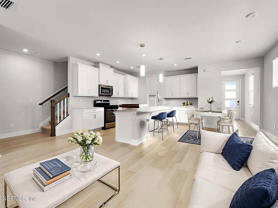 Experience low-maintenance living in the desirable Pablo Cove community. This contemporary Waverly floor plan is an end-unit townhome, offering extra privacy and an abundance of natural light throughout. It features 3 beautifully designed bedrooms, 2.5 bathrooms, and a versatile upstairs loft, perfect for a home office, playroom, or media space. The open-concept main floor showcases a modern kitchen with quartz countertops, stainless steel appliances, a spacious breakfast bar, and a generously sized walk-in pantry providing ample storage and convenience for everyday living and entertaining. Upstairs, all bedrooms are thoughtfully arranged for privacy, including a generous primary suite complete with a custom walk-in closet for enhanced organization and functionality. Additional upgrades include Shark Coating on both the patio and garage floors, offering durability and a clean, polished finish. The rear sliding door is fitted with remote-controlled electric blinds, adding both convenience and a modern touch to your indoor-outdoor living experience. Residents enjoy access to resort-style amenities, including a pool, clubhouse, and fitness center. Located just minutes from Mayo Clinic, UNF, St. Johns Town Center, and Jacksonville's beautiful beaches, this move-in-ready townhome offers the perfect blend of comfort, style, and location. Don't miss your chance to own in one of Jacksonville's most sought-after communities!