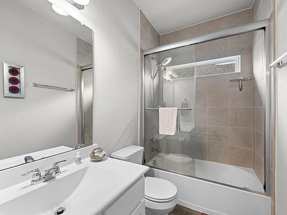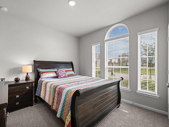 Motivated seller! This like-new home boasts an open floor plan with soaring vaulted ceilings & wood-look tile throughout the main areas. The island kitchen includes stainless steel appliances, pendent  swell as recessed lighting & refrigerator that stays. Up front you’ll find 2 spacious secondary bedrooms with full bath plus a media/office with barn doors prewired for surround sound. Living room comes with mounted TV. The primary suite features double sinks, frameless shower, soaking tub, separate wet room & large walk-in closet. Bedrooms have plush like-new carpet. Outdoors, enjoy a covered patio & spacious backyard with room for a pool. Extras include garage door opener & whole-home water filtration system. Move-in ready!