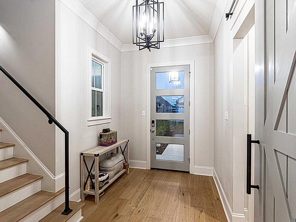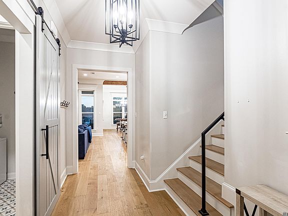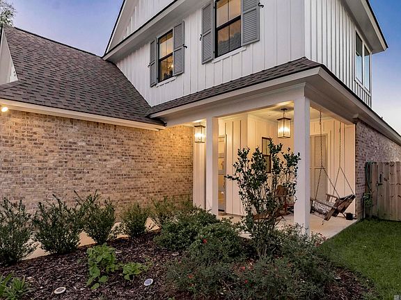 This stunning 3 bedroom, 2.5 bath lakefront home in the prestigious Audubon Parc subdivision is a must-see. Just under 3 years old, it combines modern elegance with timeless charm. A warm, welcoming porch with a swing sets the tone as you step through the front door into a bright foyer. A stylish gray barn door separates the garage entrance and laundry area, adding a unique touch to the home. Upgraded light fixtures, beautiful ceramic tile, and wooden floors flow throughout, while a striking wooden staircase leads to two upstairs bedrooms and a full bath.The living room centers around a gray accent fireplace, perfect for cozy winter evenings, with large windows flooding the space with natural light. The formal dining area is ideal for family meals, while the gourmet kitchen is a chef’s dream, featuring a wall oven, large island with a farm-style sink, gas stove, stainless steel appliances, marbled granite counter tops, a walk-in pantry, and ample cabinet space.The spacious master suite offers a private retreat, with double doors opening to a luxurious bathroom featuring a standalone tub, a glass-enclosed shower, a double vanity with a full-width mirror, custom tile flooring, and an over-sized walk-in closet with shelving for all your needs. There's an office downstairs as well that is conveniently located near the half bath. Outside, the patio is perfect for entertaining, offering both covered and uncovered areas to suit any weather. The fully fenced backyard provides unobstructed views of the serene lake. The neighborhood is close to essentials, including a hospital, grocery stores, restaurants, a gym, parks, shopping, and top-rated schools, making it the perfect place to call home.