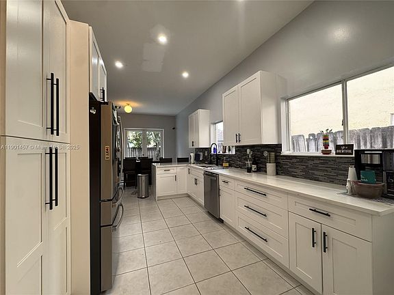 Beautifully updated and well maintained home with volume ceilings, and modern finishes feauturing a custom kitchen with quartz countertops, S/S appliances, and white shaker cabinetry providing plenty of storage. An expansive primary suite boasts a large closet with an updated en-suite bathroom equipped with dual sinks and an oversized walk-in glass shower, while the 3 additional bedrooms are complemented by another stylish bathroom. Private fenced backyard with an inground pool, cabana bath, and fruit trees are perfect for outdoor living with family and friends. This home includes 2-car garage, additional parking, hurricane shutters, and a prime location near A+ schools, parks, shopping, Krome Ave, and future highway access—blending comfort, convenience, and the Florida lifestyle. No HOA.