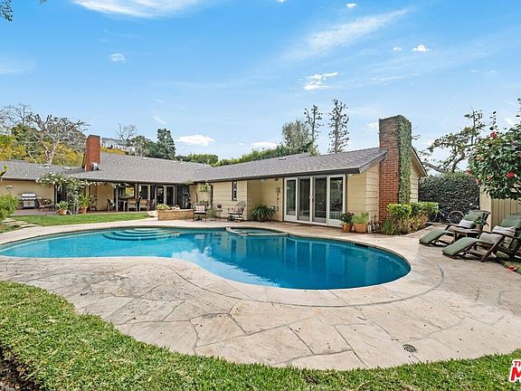 This Classic California Ranch Style home features approximately 2,500 square feet of living space on a large lot with three bedrooms and two bathrooms, and office/den a well as a formal dining room and gourmet kitchen with modern appliances. The property has been very well maintained and is in the desirable area of the Polo Fields with close proximity to the Brentwood Country Mart and great shops and restaurants. Upon entering, the inviting entryway sets the tone for the home's elegant and welcoming ambiance. The interior boasts beautiful refinished hardwood flooring in all the main living areas. Living room features ample space for entertaining and a beautiful fireplace. There is a formal dining room opening to the large gourmet kitchen featuring modern appliances, a center island as well as a huge amount of cabinet storage and doors opening to covered patio and BBQ area for entertaining. Large laundry room with LG Washer/Dryer. A functional office or den is located off the living room and 2nd bath. There are 2 more bedrooms and the primary suite which features a cozy fireplace, a walk in dressing room with closets and a primary bathroom with both tub and shower. The backyard offers an inviting outdoor living experience, with a covered patio for dining, a BBQ and lounging area, a gas fire pit, beautiful pool and spa...perfect for enjoying the tranquil surroundings. There is a grassy yard as well as a ficus hedge for privacy. Take this home to the next level or or enjoy life as it is! There are many options here!