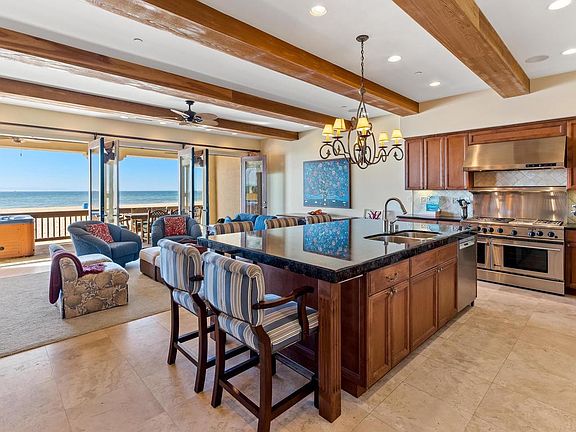 Fantastic white water and Channel Islands views! Watch the dancing dolphins from this beautiful ocean front home located in ''the wedge'' on Mandalay Beach/Oxnard Shores. Built in 2003, the home features a beachfront family room including beamed ceilings, a stone fireplace and surround sound. The French doors open to the deck leading to an inviting spa and is only a few steps from the sand. The open gourmet kitchen is adjacent to the family room with a large center island with abundant seating, and stainless appliances. Five large en-suite bedrooms, including one bedroom downstairs. One laundry room is located downstairs and can also be accessed from the exterior for sandy towels and feet. An additional laundry room is located upstairs. The master suite includes a gym, coffee bar, comfortable sitting area with ocean views and double-sided fireplace. Enjoy a warm bath in the master bathroom's soaker tub while enjoying the ocean view and fireplace! In addition, there is a large walk-in closet and dressing area. The upstairs work space offers built-in shelves and desk. This stunning property has 4 fireplaces (one exterior), an outdoor shower, central air and heat as well as space to potentially install an elevator.