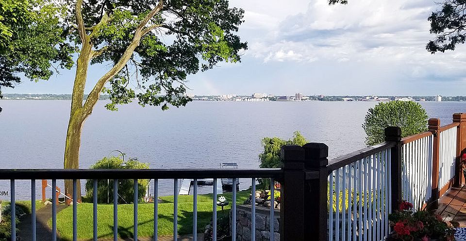 Waterfront home on rolling hills in North Muskegon with magnificent views and private sandy beach.