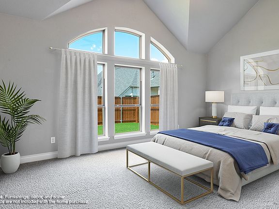 Extended entry with 12-foot ceiling leads to open family room, kitchen and dining room. Family room features a 12-foot ceiling, wood mantel fireplace and wall of windows. Kitchen features generous counter space, 6-burner gas range top, double wall oven, walk-in pantry and island with built-in seating space. Game room with French doors just off family room. Primary suite includes bedroom with 13-foot ceiling and wall of windows. Dual vanities, freestanding tub, separate glass-enclosed shower and two walk-in closets in primary bath. A Hollywood bath adds to this four-bedroom home. Extended covered backyard patio and 7-zone sprinkler system. Mud room off three-car garage. Representative Images. Features and specifications may vary by community.